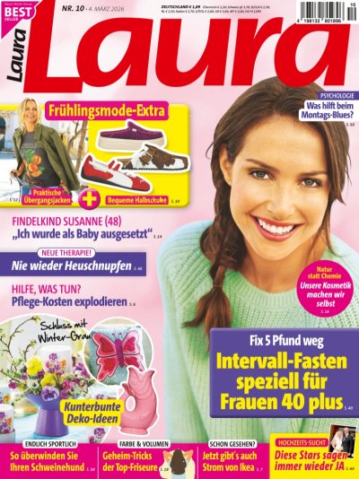 Laura zeigt Ihnen im Abo jede Woche die Trends aus Mode und Beauty – für jeden einfach umsetzbar. Laura ist die Zeitschrift für Frauen, die aktiv sind und ihren Alltag organisieren müssen.