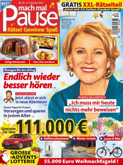 Die Zeitschrift mach mal Pause macht Ihrem Namen alle Ehre! mach mal Pause ermöglicht Ihnen Abwechslung und Entspannung für zwischendurch. Witzige Reportagen, Gesundheits-Tipps und wichtige Ratgeber-Themen sind Teil jedes Heftes. Mit dem Abo der mach mal Pause sind Sie jede Woche mit einer Vielzahl an Rätseln und Gewinnspielen versorgt und erhalten dazu noch eine Menge wertvoller Empfehlungen für den Alltag. Wer anspruchsvollen Denksport liebt und sich zwischendurch mit unterhaltsamen Geschichten entspannen möchte, hat mit dieser Zeitschrift den passenden Begleiter gefunden.