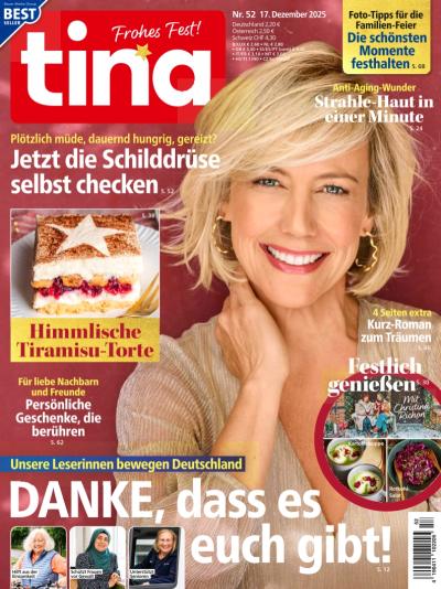 Die Zeitschrift tina ist das Premium-Frauenmagazin und seit 50 Jahren das Original! Im Abo liefert tina jede Woche einen breiten Themenfächer für den Alltag der Frau. Außerdem finden Sie in der tina die besten Rezepte aus unserer Versuchsküche und den praktischen Rezeptplaner für die ganze Woche. Die Zeitschrift zeigt Ihnen im Abo, wie man gesund und fit bleibt und gibt Rat für alle Lebensbereiche. Auch das Thema Unterhaltung kommt keineswegs zu kurz: in der tina finden Sie viele Berichte über interessante Menschen, spannende Ereignisse und aktuelle Themen.